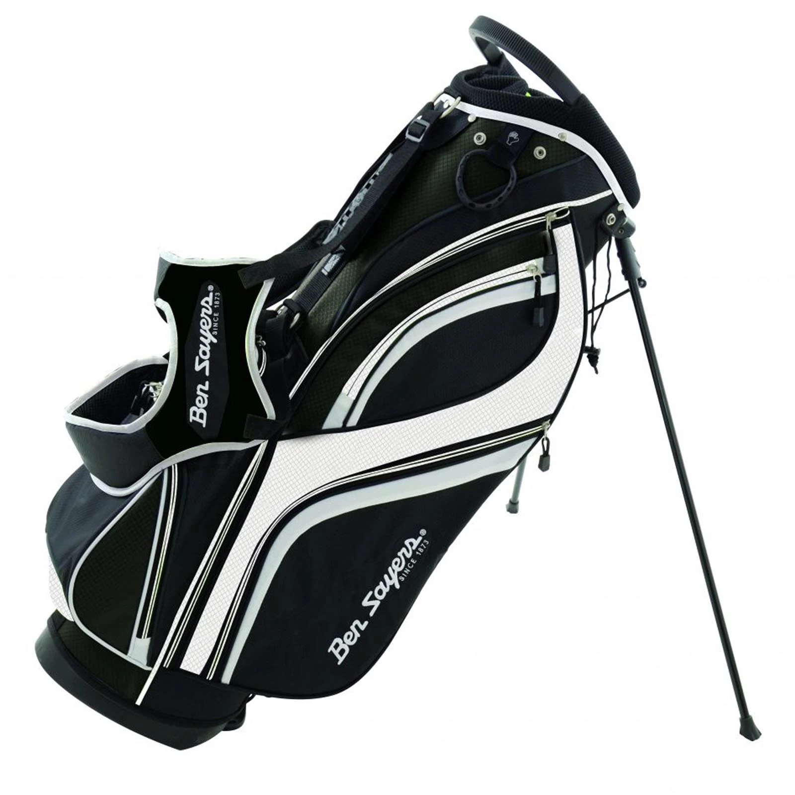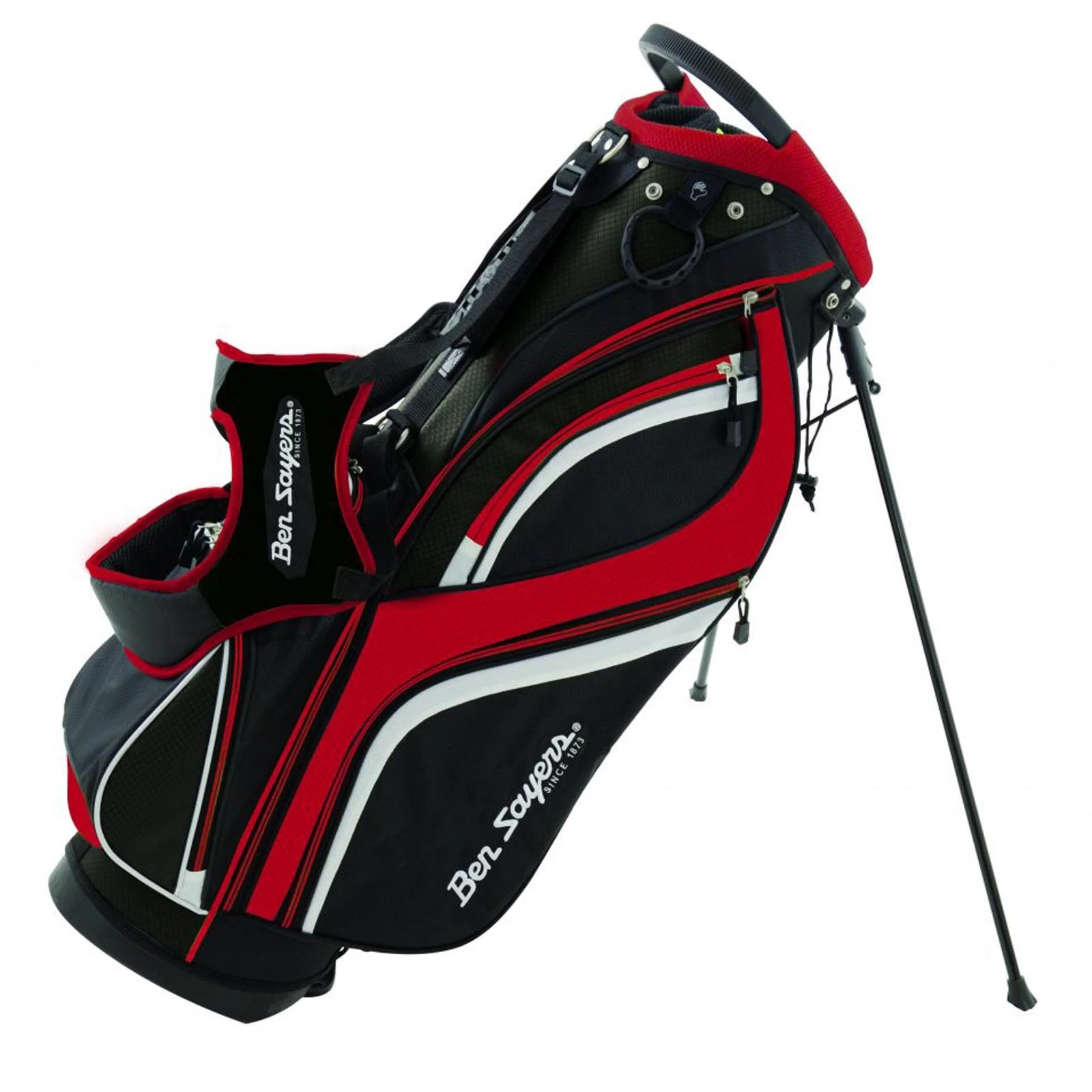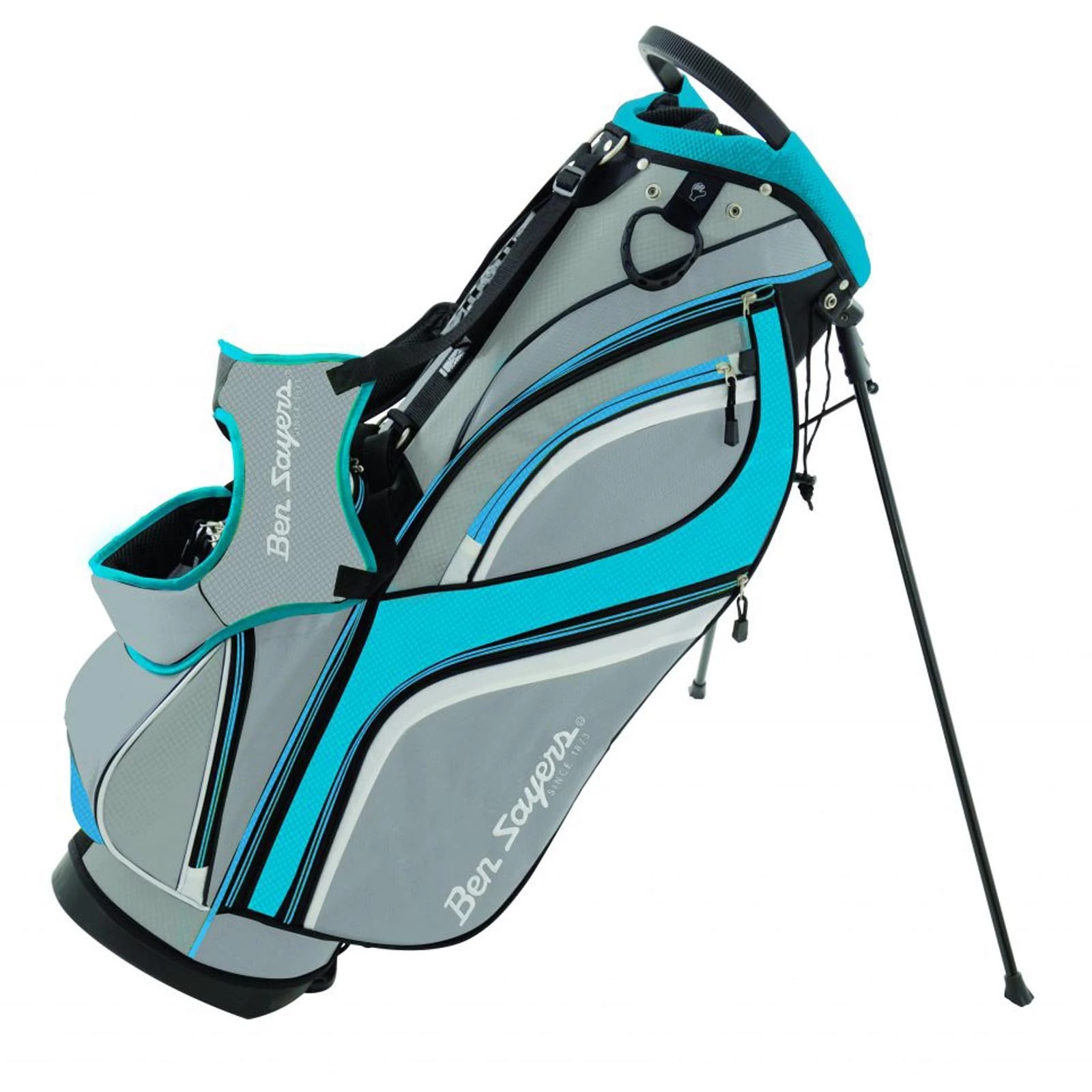 Ben Sayers equipment offers exceptional quality at an affordable price. The DLX stand bag features every conceivable luxury needed for stress-free golf. With an 8.5 inch top and 14-way graphite friendly divider system to keep your clubs tangle-free and perfectly segregated. The high-quality stand mechanism also provides an easy, no-fuss operation. The fully adjustable dual shoulder straps ensure equal weight distribution as well as padded lumbar support for added comfort.