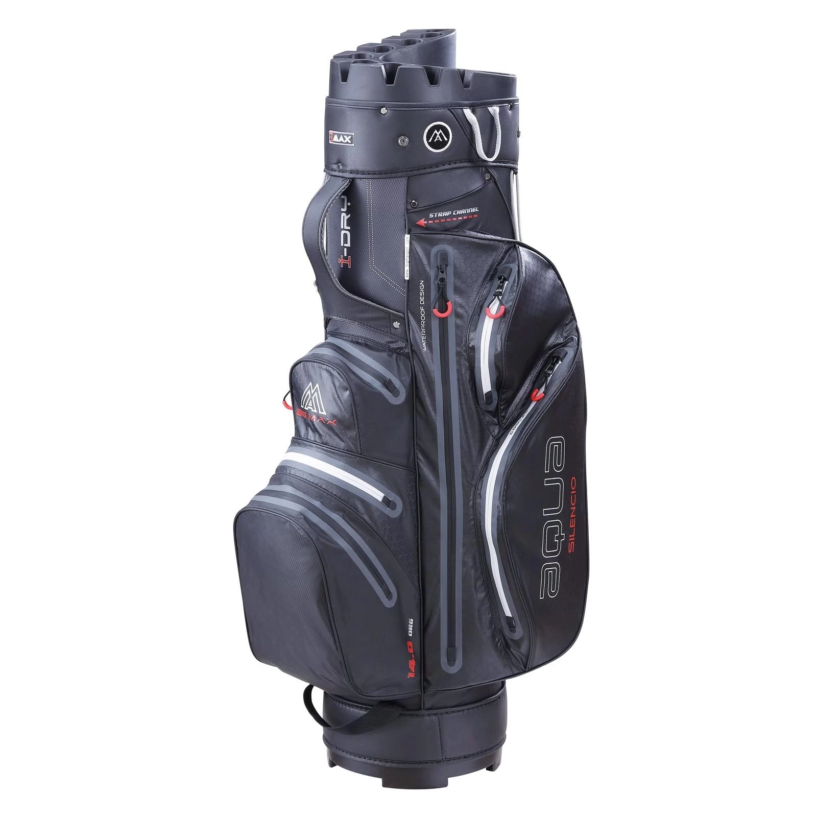 The new Aqua Silencio 3 cart bag from Big Max has an interesting club divider/organiser system in place where each club has its own slot that holds them in place so you do not have the rattle of your clubs are you stride down the fairway. This includes a putter well that can accommodate a putter that has an oversize grip. There are two handles on the bag for easy transportation.