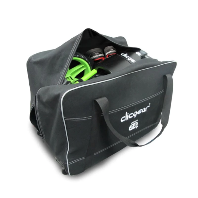 Clicgear Wheeled Travel Cover is the perfect way to transport your Clickgear trolley and protect your car boot. This strong heavy duty travel bag is ideal for carrying and protecting your trolley with its pull handle, in-line wheels and padded bag. Clicgear has designed this wheeled storage/travel cover from a tough, padded splash-proof polyester with a full-length zipper which makes it extremely easy to open and close. It also has a rubberised base and two internal pockets for extra storage space.